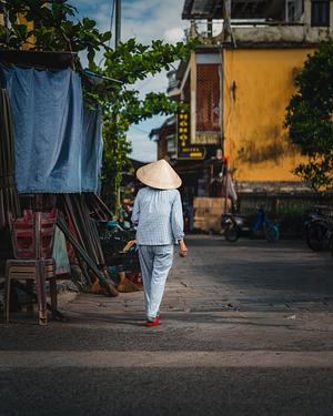 Captured in the heart of Hội An, this quiet moment shows a woman in light blue pajamas and a conical nón lá hat walking alone through the sunlit streets. Her red slippers pop against the muted tones of the scene — a subtle detail that adds warmth and character. The photo captures the gentle pace of life in Vietnam, where the everyday becomes cinematic in its stillness.