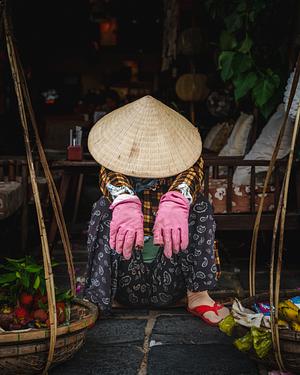 Tucked between two woven baskets of fresh produce, a street vendor takes a quiet moment of rest. Her bright pink gloves hang from her hands like a visual exhale — a pause in the rhythm of her daily hustle. The patterns of her clothing, the softness of her posture, and the shield of her conical hat create a portrait of contrast: vibrant and tired, bold and humble. Set against the shadows of a shop interior, the scene captures a rare stillness in an otherwise bustling Vietnamese street — a glimpse into the resilience and humanity behind every transaction.