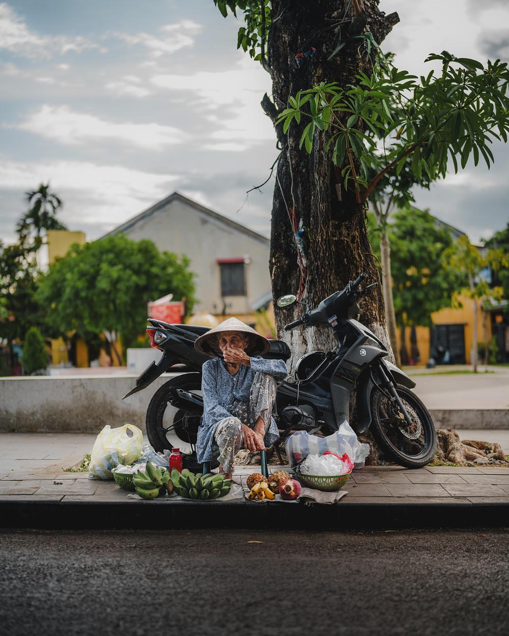 Under the soft morning sky in Hội An, an elderly vendor sits patiently beside her motorbike, surrounded by fresh fruit and everyday essentials. There's a quiet dignity in her presence—a reminder that resilience and routine often share the same seat.