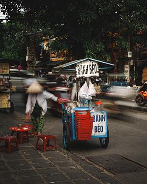 A fleeting moment on a bustling Vietnamese street. A vendor reaches for a plastic stool while motorbikes blur past in a rush of movement. The bánh bèo cart stands still—anchored in tradition amidst the chaos—offering a quiet slice of everyday life to anyone willing to stop.