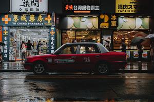 A red taxi idles beneath glowing storefronts on a rainy evening in Hong Kong, its windows fogged with life. Reflections ripple across the wet pavement while umbrellas cluster outside the café—each person waiting, watching, or simply passing through. A cinematic still of city life unfolding under cover of light and drizzle.