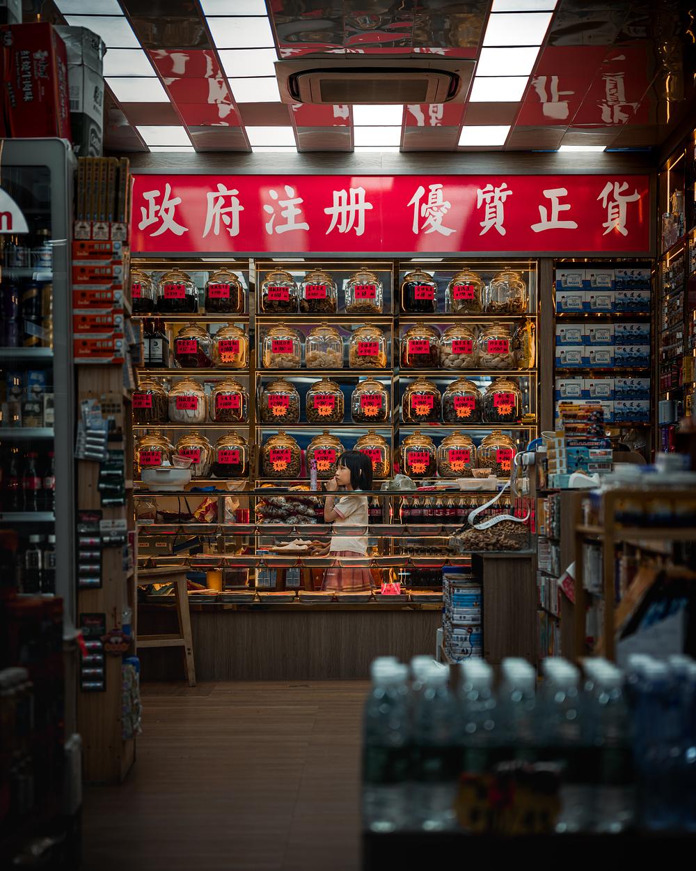 A young girl stands behind the glass of a traditional Chinese medicine shop, dwarfed by towering jars filled with herbs and remedies. Her gaze is focused, almost entranced — a quiet moment of curiosity surrounded by a sea of red labels and golden reflections. The symmetry of the shelves, the soft overhead light, and the rows of mysterious contents create a scene that feels both timeless and intimate — a glimpse of wonder inside a city corner often passed by.